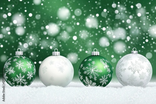 © Rayhanbp, Fototapeta premium Green and white ornaments in snowy scene