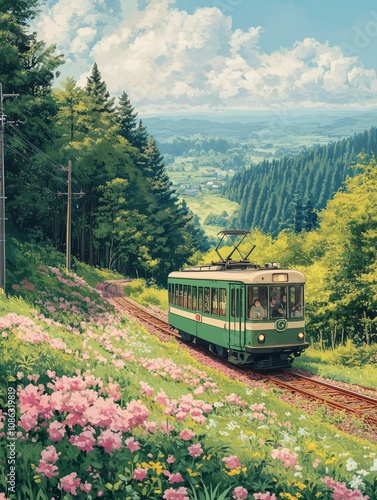 Naklejka premium green and white tram train, green trees, pink flowers, forests, mountains