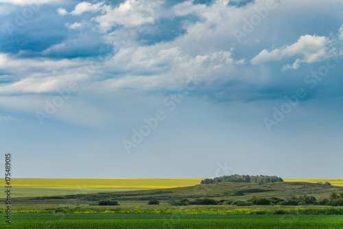 Fototapeta premium Green and yellow fields under the beatiful dramatic clouds