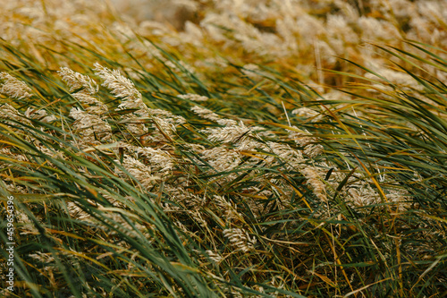 © Dmitry, Fototapeta premium Green and yellow grasshopper bending in the wind