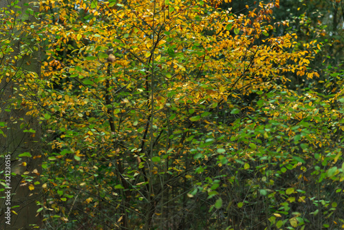 Fototapeta premium Green and yellow leaves in autumn forest.