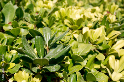 © Olga, Obraz premium green and yellow leaves in sunlight