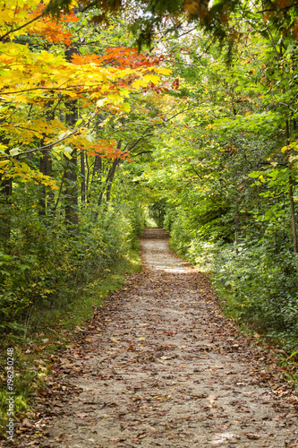 © Brian, Fototapeta premium green and yellow leaves on a path way in the fall