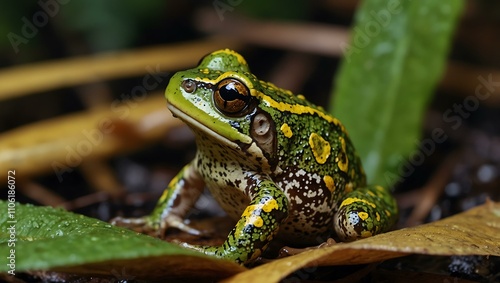 Fototapeta premium Green and yellow-patterned frog in wet leaves.