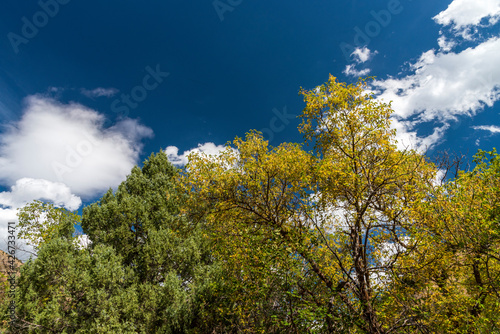 © John, Fototapeta premium Green and yellow tree tops against a blue sky with white fluffy clouds.