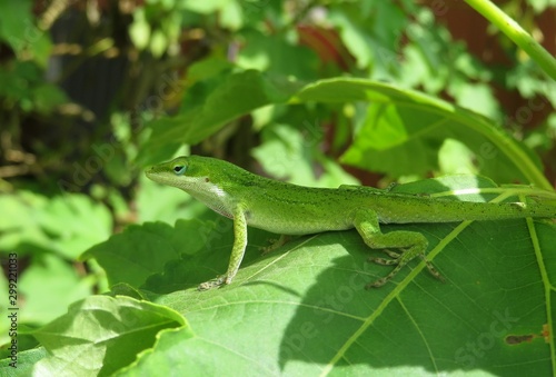 Naklejka premium Green anole lizard on leaves background in Florida nature, closeup
