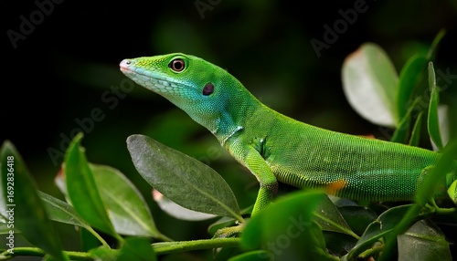 © Donald, Fototapeta premium green anole lizard sitting amongst green foliage against a dark background
