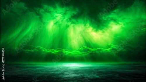 © Sajjad, Fototapeta premium Green aurora lights glowing over calm ocean under dramatic cloudy sky at night