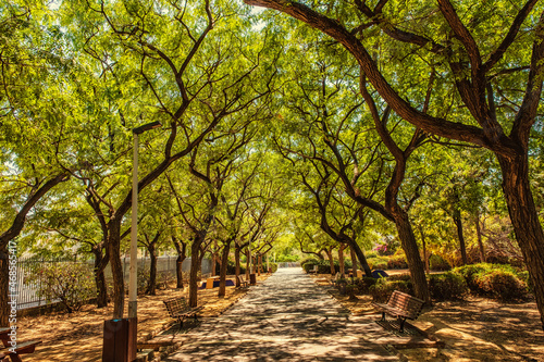 © Leonid, Naklejka premium Green avenue of trees in a city park
