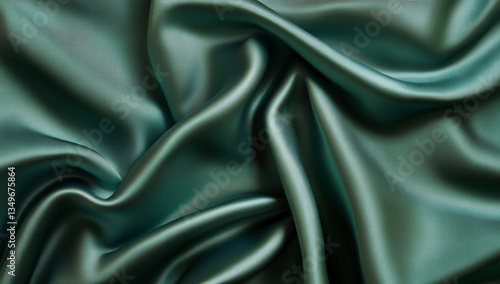 © Nishat, Obraz premium Green background, smooth green fabric texture with waves.