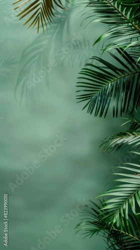 © DreamPointArt, Fototapeta premium Green background with palm leaves. Minimalism, blank space.