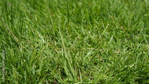 © Suardi Tan, Obraz premium Green backyard grass closeup view.