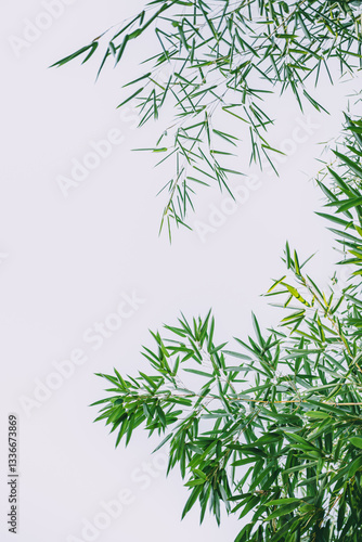Naklejka premium Green bamboo branches with delicate leaves extend into a bright, clean sky, creating a fresh and natural backdrop. The minimalistic composition highlights the beauty of tropical foliage.