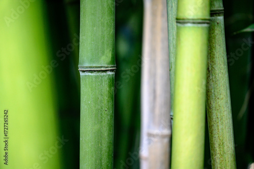 © Michael, Obraz premium Green bamboo forest close up with lush leaves and stems in a tropical garden setting