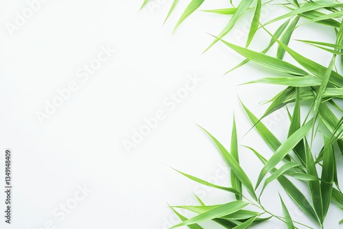 © BWS Stock, Fototapeta premium Green Bamboo Leaves Arranged on White Background with Copy Space