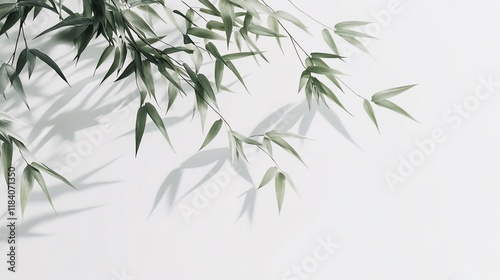 Naklejka premium Green bamboo leaves cast shadows on white background.