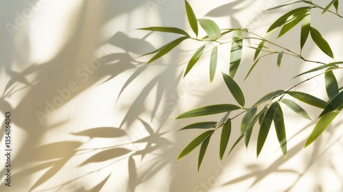 © Rere_Art151, Fototapeta premium Green Bamboo Leaves Casting Shadows on a Light Colored Wall
