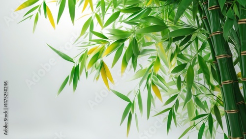 © Seyyar, Obraz premium Green bamboo leaves on a blank white surface.