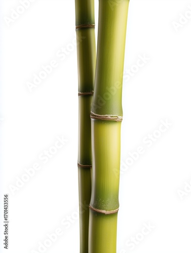 © Tima, Obraz premium Green bamboo stalks arranged vertically against a white background. The bamboo is healthy and vibrant, showcasing its natural color and texture.