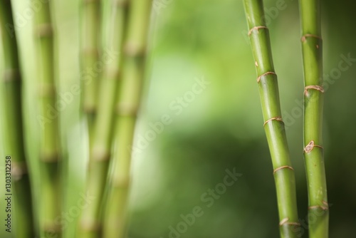 Fototapeta premium Green bamboo stems on blurred background, closeup. Space for text