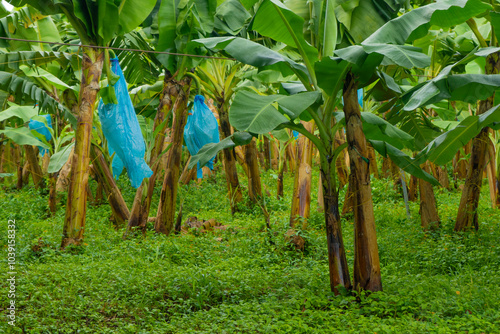 © alexander, Fototapeta premium Green bananas tree hanging at harvest