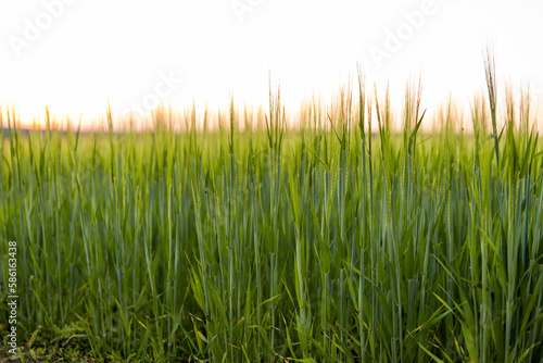 Fototapeta premium Green barley field in spring. Amazing rural landscape. Sun over fields of...