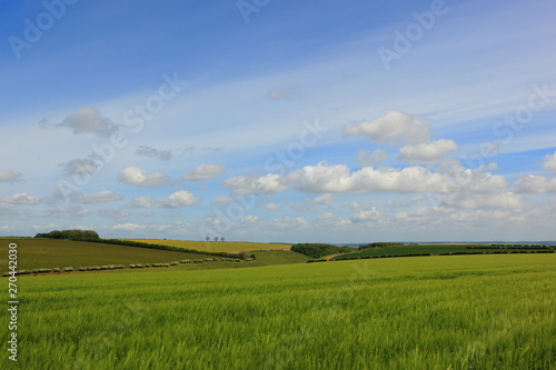 © emjay smith, Obraz premium Green barley fields in a patchwork agricultural landscape in springtime
