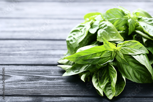 © 5second, Fototapeta premium Green basil leafs on black wooden table