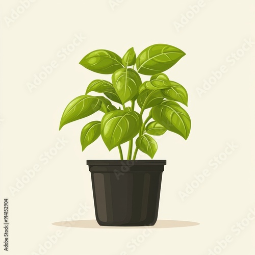 © Cheetose, Fototapeta premium Green Basil Plant in a Black Pot.