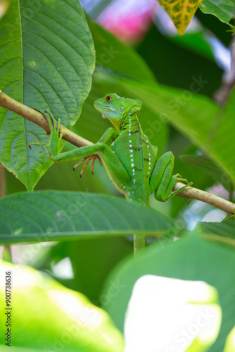 © fluffandshutter, Naklejka premium Green Basilisk (Basiliscus plumifrons) spotted outdoors