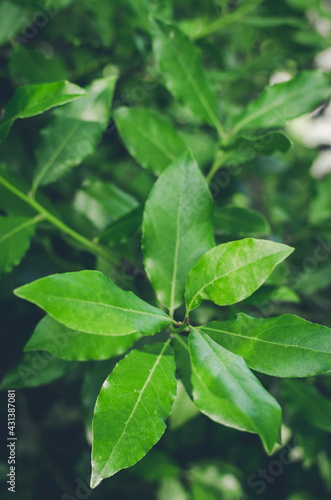 © Nelli Kovalchuk, Fototapeta premium Green bay leaf growing in nature