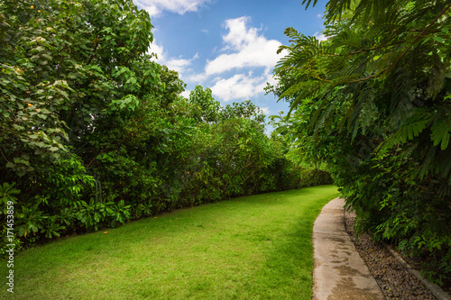 © Suradech, Obraz premium Green beautiful park and cloudy blue sky