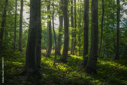 Fototapeta premium Green beech forest in the sun