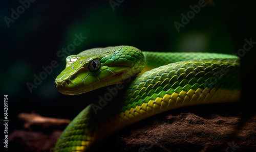Fototapeta premium Green big snake close up in nature. Green tree python. Generative AI