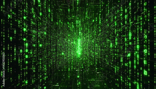 © watz, Obraz premium Green binary code streams down a dark background creating a digital rain effect with a sense of depth and technological immersion.