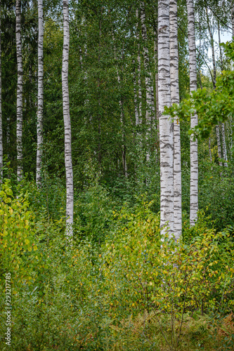 © Martins Vanags, Fototapeta premium green birch trees with some yellow colored autumn leaves