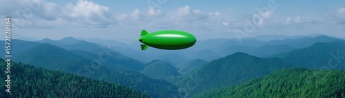 Fototapeta premium Green Blimp Floating Over Serene Mountains Under Blue Sky with Fluffy Clouds