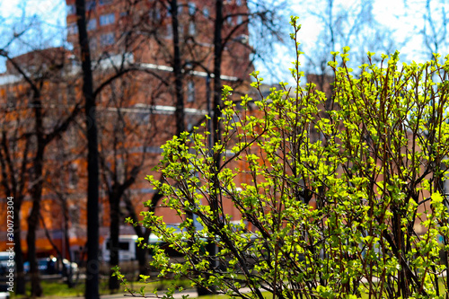 © kjvision, Fototapeta premium Green blooming bush in a cozy city park