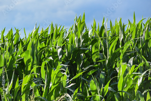 © Kozioł Kamila, Fototapeta premium Green blooming corn field in summer.