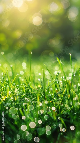 © phaloh, Naklejka premium Green border of grass with water drop, sunlight and bokeh.