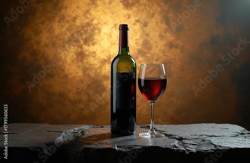 Naklejka premium Green bottle of red wine and full glass rest on rough dark stone surface. Textured golden background adds depth. Perfect for depicting tasting or celebration.