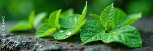 Fototapeta premium Green Brahmi leaves with dew drops on a natural stone surface, droplets,...