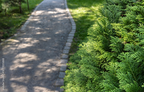 © Ivan, Fototapeta premium green branches of thuja and a path through the park
