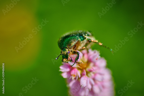 © Photo, Fototapeta premium Green bug on an pink flower with raindrops in macro