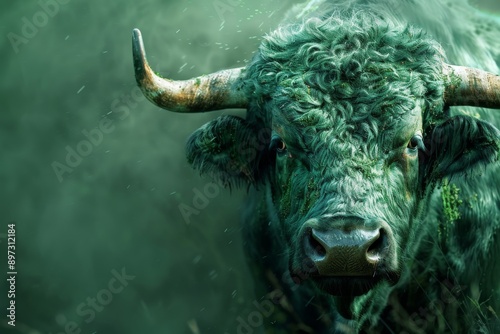 © Shahrimi, Naklejka premium Green Bull with Horns, Mystic Animal Close-Up