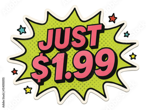 © stickerside, Fototapeta premium Green burst sticker with JUST $1.99 offer in bold comic style, vibrant retail promo on transparent background.