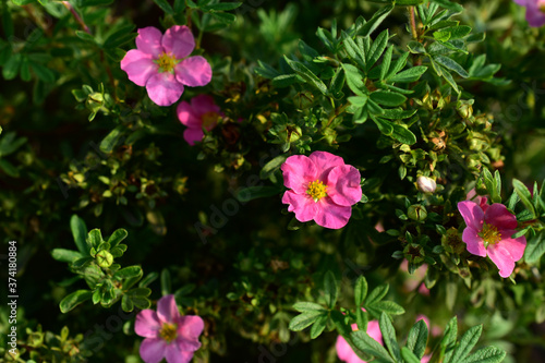 Obraz premium Green Bush with flowers Lapchatki (Potentilla) erect Kalgan close-up