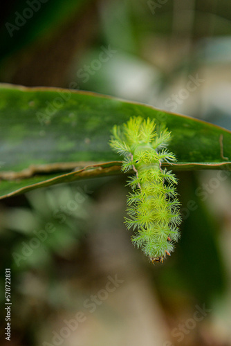 Naklejka premium green caterpillar on a leaf, wild nature, poisonous caterpillar, green caterpillar