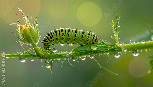 © Romi, Naklejka premium Green caterpillar with black and yellow spots rests on a dewy plant stem against a bokeh green background