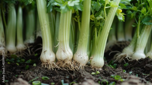 Obraz premium green celery stalks and white leeks with their roots above the ground...